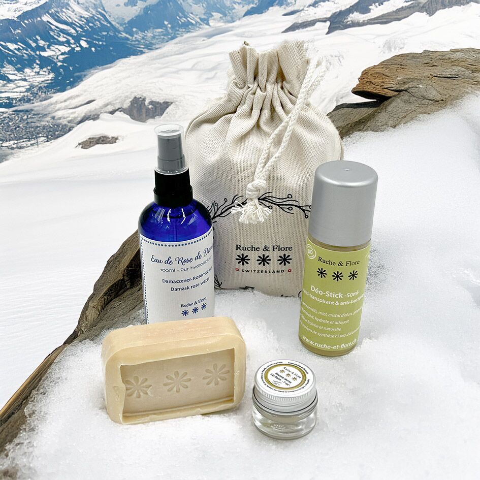 Un déodorant Bio, une eau de rose Bio, un savon à la gelée royale spécial peaux sèches et un baume à lèvres si utile en hiver.