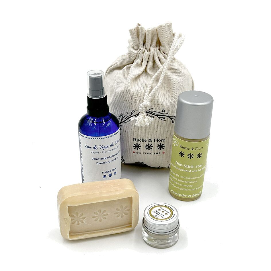 Le tout vous est expédié dans un sacs en tissu bio personnalisé Ruche & Flore et entièrement réalisé en Suisse.
