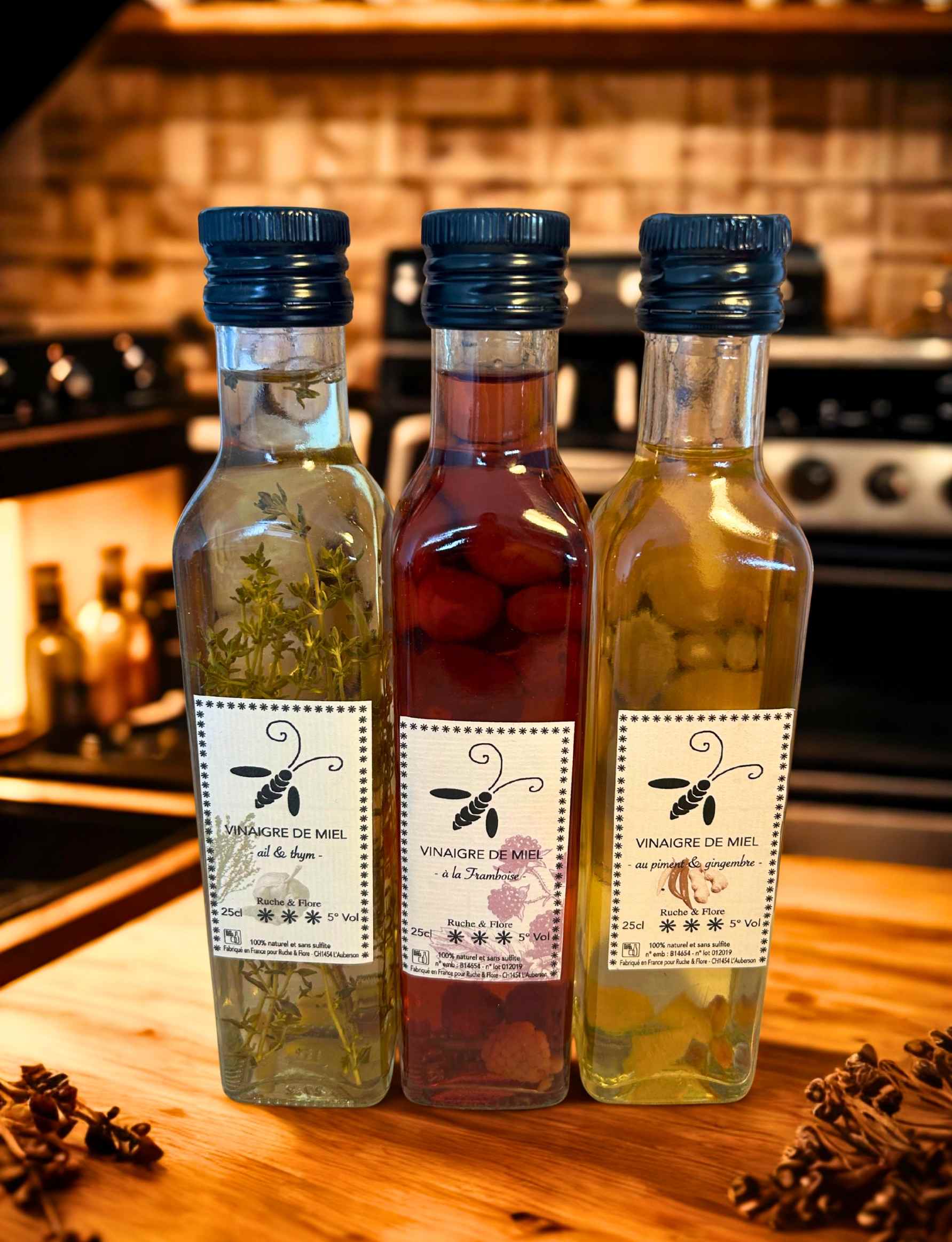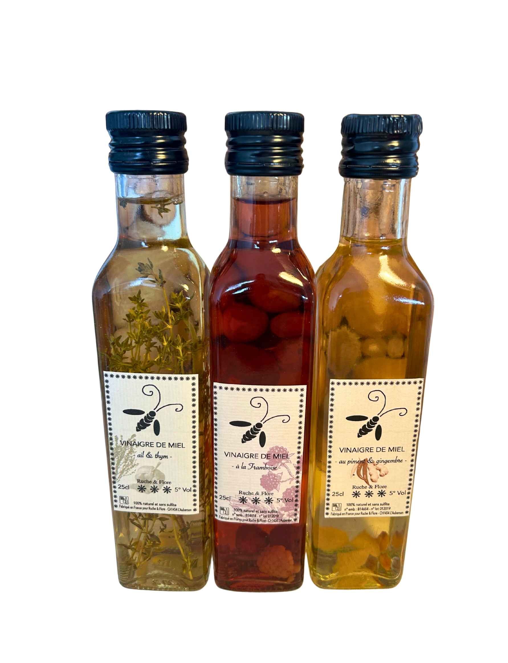 Ingrédients : Vinaigre de miel, framboises / ail et thym / piment et gingembre (selon la bouteille).