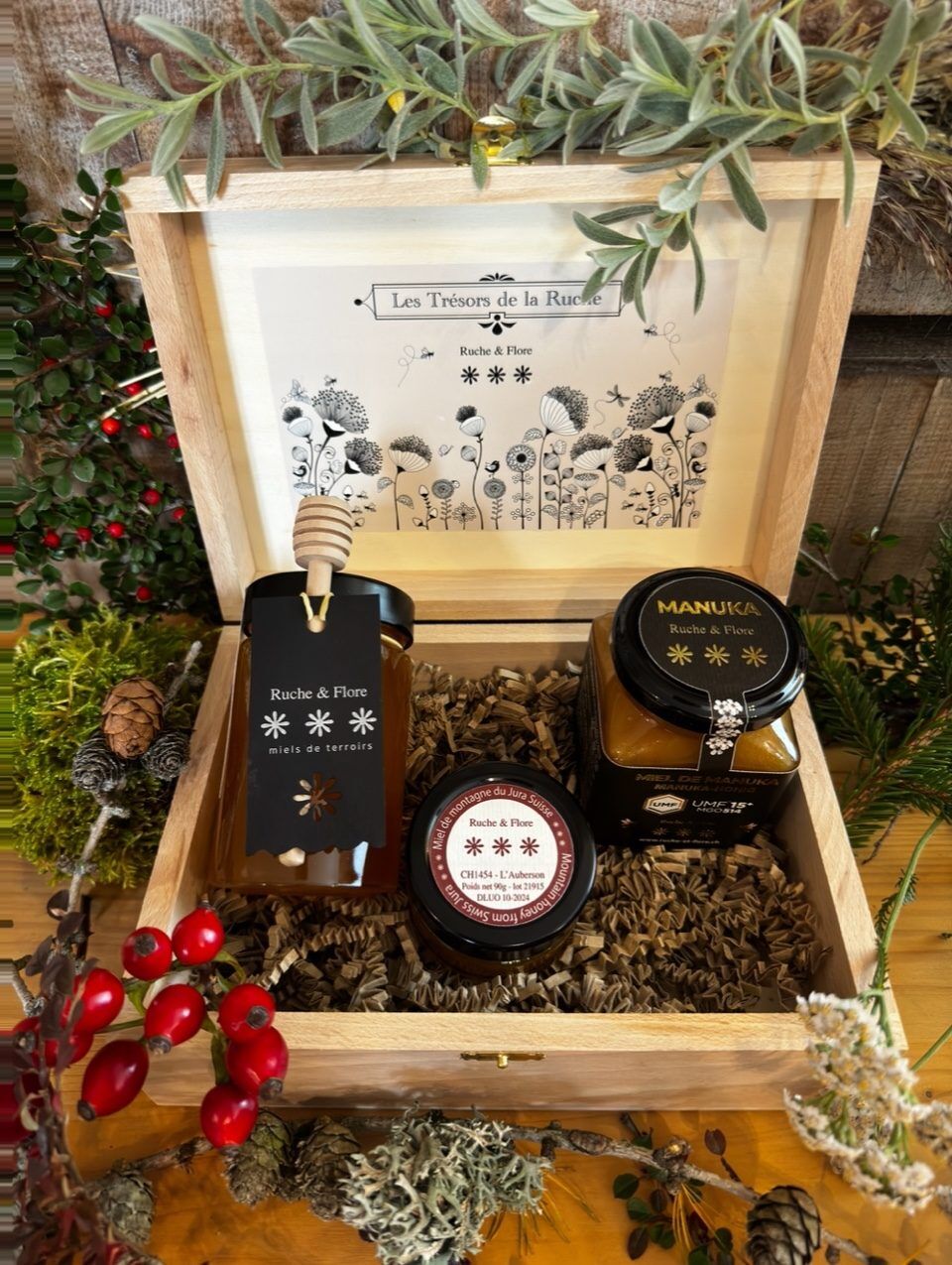 Coffret des Merveilles composé d’un miel de printemps de montagne, d’un mini-miel de montagne et d’un miel de Manuka.