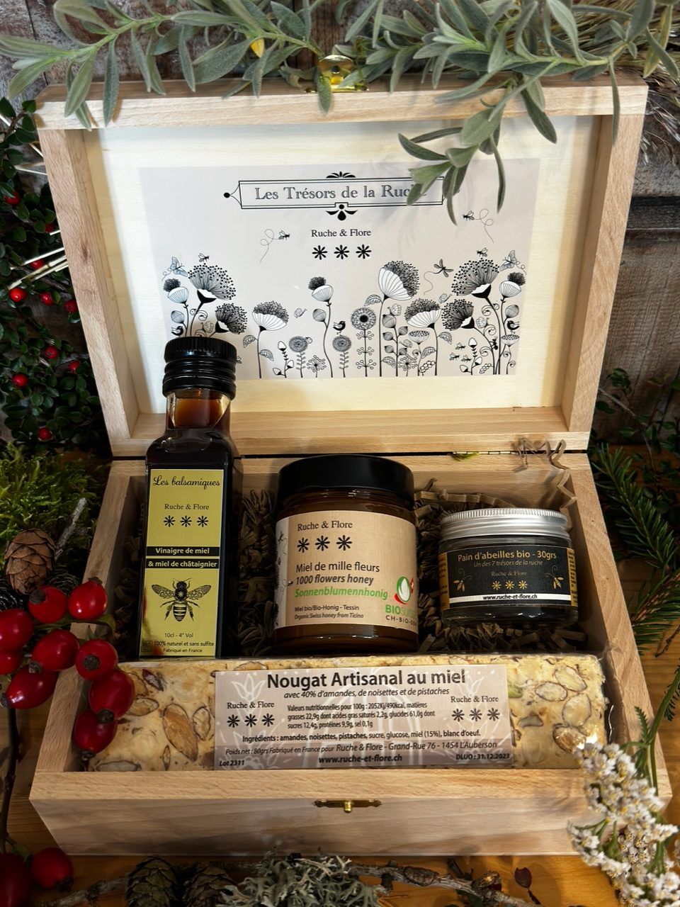 Coffret Douceur Hivernale composé de vinaigre balsamique au miel, d’un incontournable miel du Tessin, d’un pot de pain d’abeilles bio et d’une barre de nougat au miel.