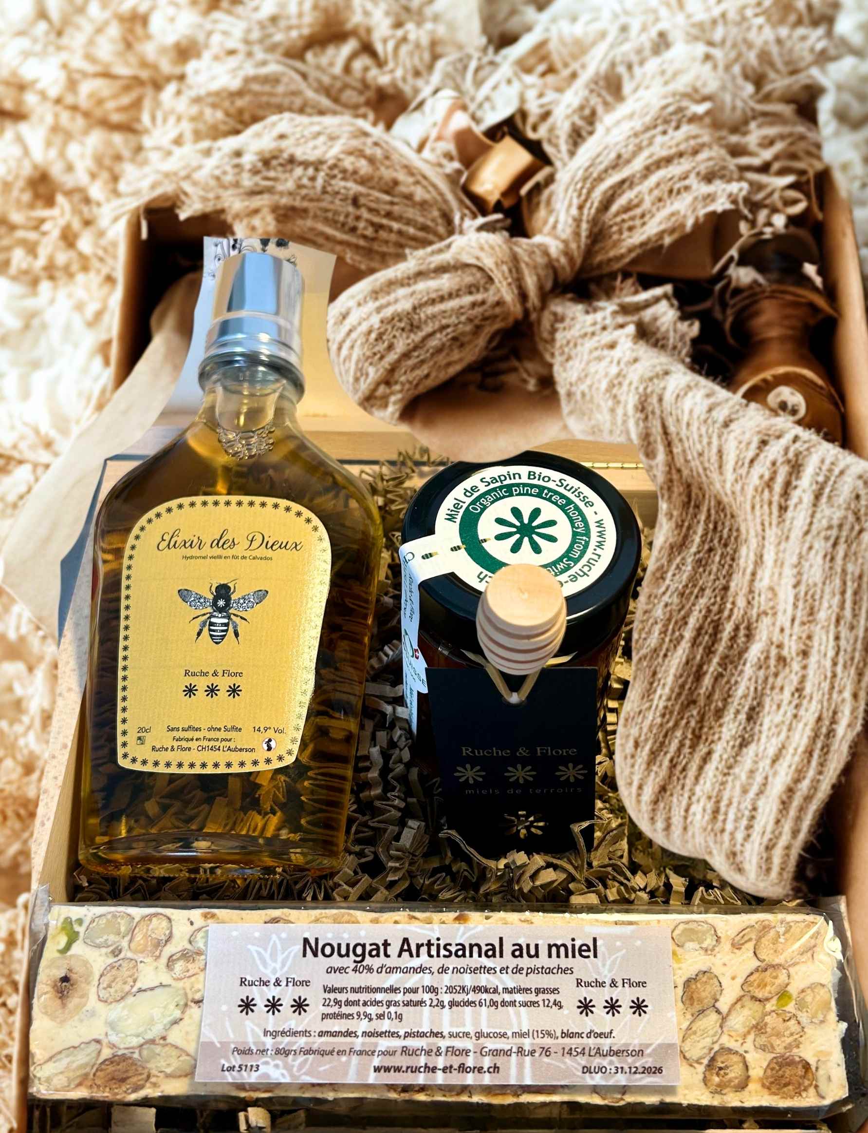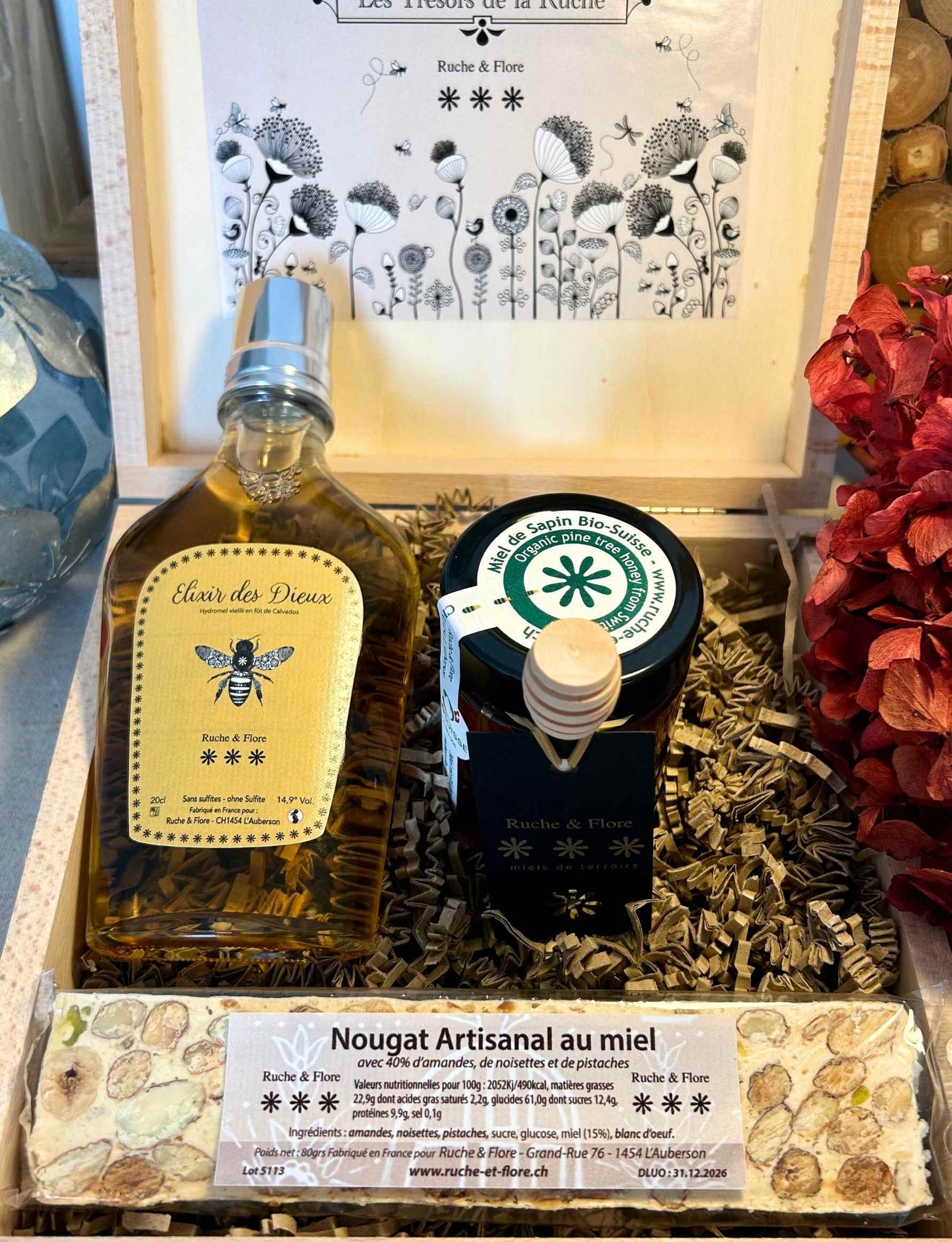 Le Coffret Élixir Gourmand réunit trois produits d’exception : un miel de montagne du Jura, un hydromel vieilli un an en fût de calvados et un nougat artisanal au miel. Présenté dans une boîte en bois de hêtre estampillée Ruche & Flore, ce coffret naturel et raffiné est idéal à offrir pour Noël ou toute occasion gourmande.