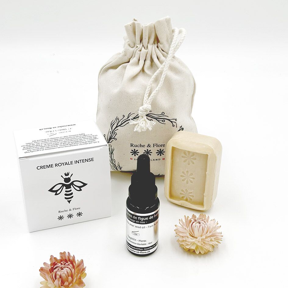 Pack exclusif d’une Crème Royale Intense, d’une Huile de pépins de figue de barbarie et d’un Savon à la gelée royale.