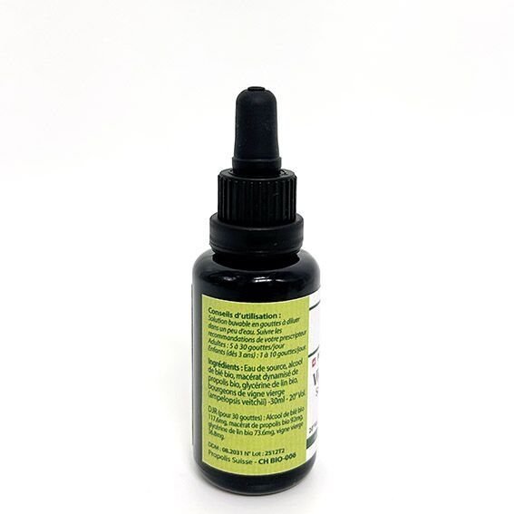 DJR (Dose journalière recommandée - sur la base de 30 gouttes/jour) : Alcool de blé bio 117.6mg, macérat de propolis bio 92mg, glycérine de lin bio 73.6mg, vigne vierge 36.8mg